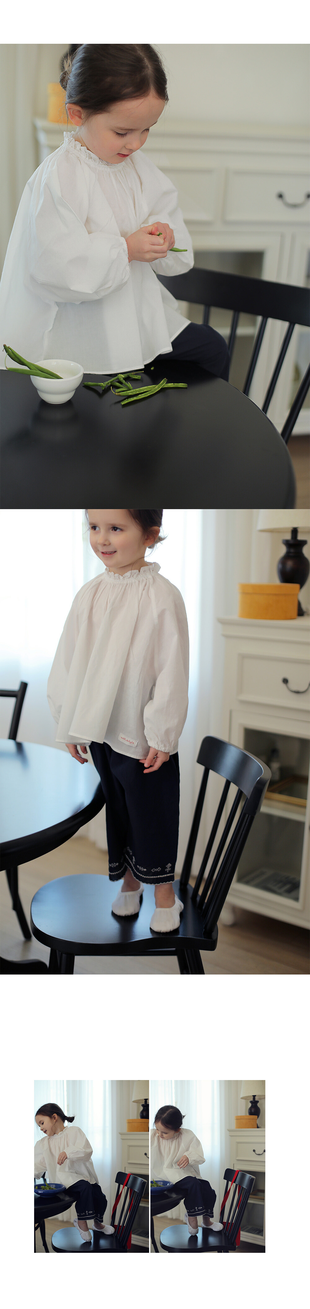 네크라인과 소매에 조글조글하게 잡힌 셔링이