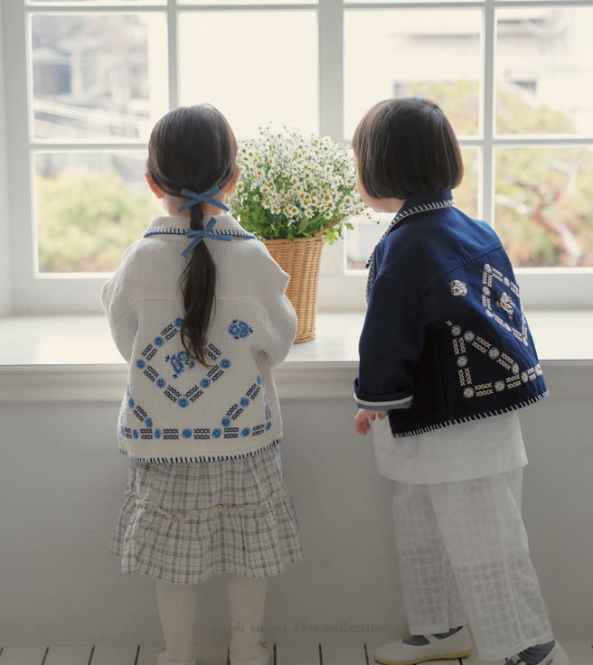 카라와 단작을 따라 이어진 멜로 자수 스티치,