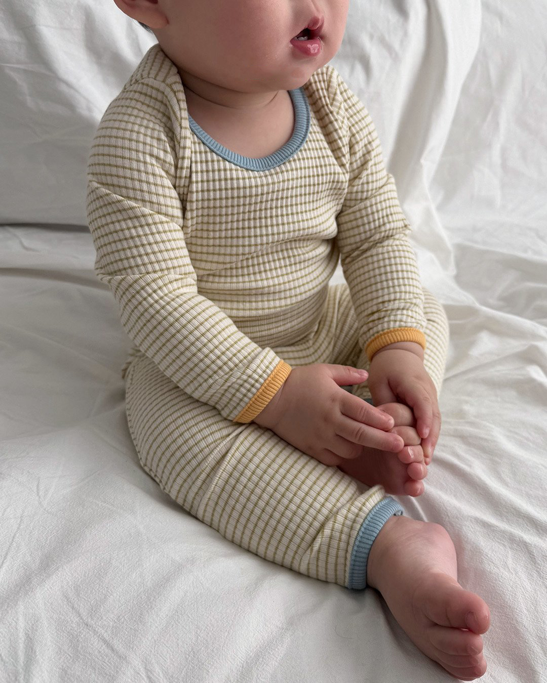 넥라인과 손목,발목에는 배색의 랍빠를 둘러주어